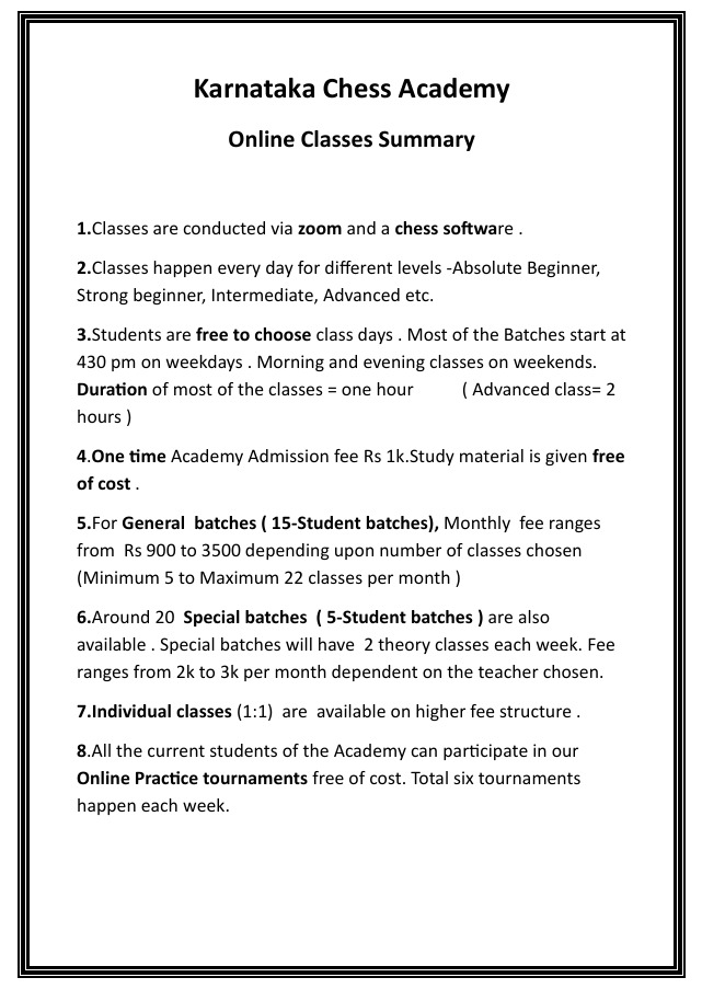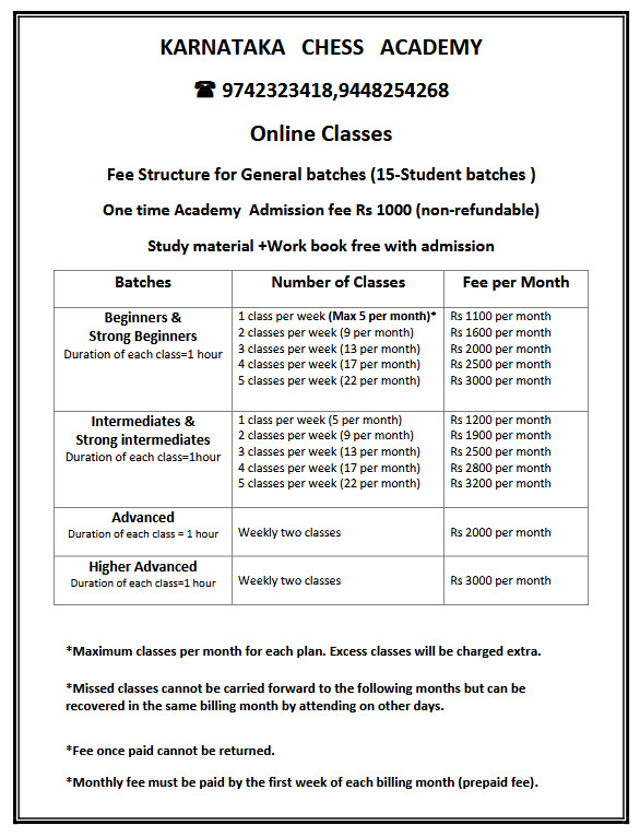 - Silence must be maintained in the class. Nothing other than chess can be discussed. We keep our right to warn/ suspend any student from the class.